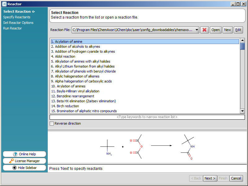 Click on Open to browse the file system, or you can draw a new one in place by clicking on button New. When the imported reaction file contains multiple reaction definitions, select a reaction from the loaded list. You can narrow down the list of reactions by using the search field at the bottom of the list. Reactor users can enjoy a library of important synthetic organic reactions predesigned by experts (See the list of available reactions or download the full library).