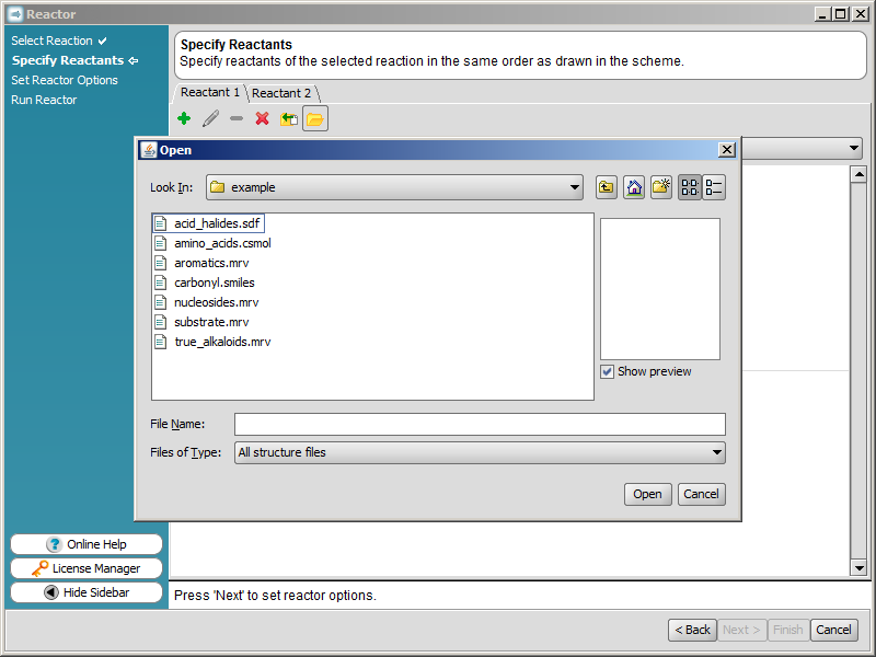Specify the corresponding reactants. The order of the reactants / reactant files corresponds to the reactant order in the given reaction equation.