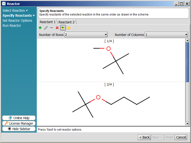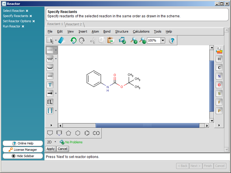 Specify all the reactants that the reaction equation requires. Click on Next to continue.
